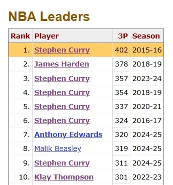 而在联盟三分数据的顶端,有一座几乎无法企及的高峰——勇士球星库里在2015-16赛季创造的402记三分命中纪录。10年过去,无人逼近,甚至无人敢言打破。